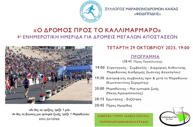 Η εκδήλωση διοργανώνεται από τον Σύλλογο Μαραθωνοδρόμων Αχαΐας “Φειδιππίδης” και αποτελεί την 4η Ενημερωτική Ημερίδα που αφορά στις διαδρομές μεγάλων αποστάσεων.