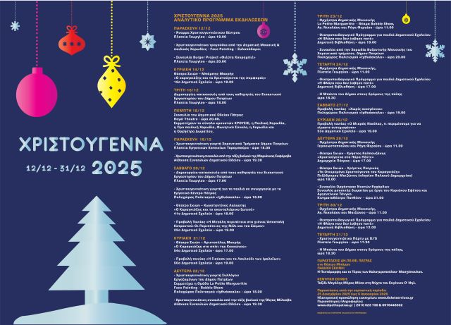 Με το άναμμα του Χριστουγεννιάτικου Δέντρου στις 18.00 το απόγευμα της Παρασκευής 12 Δεκεμβρίου, ξεκινούν οι εκδηλώσεις που διοργανώνει και φέτος ο Δήμος της Πάτρας για τα Χριστούγεννα και την Πρωτοχρονιά.