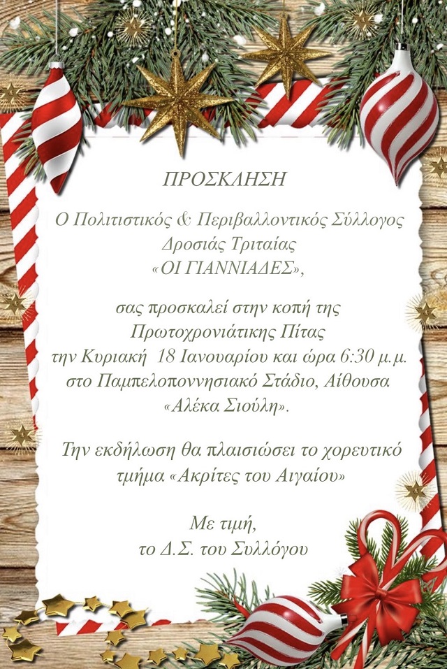 Την Κυριακή 18 Ιανουαρίου 2026, στις 18:30, θα πραγματοποιηθεί στο Παμπελοποννησιακό Στάδιο, στην αίθουσα “Αλέκα Σιούλη”, η κοπή της Πρωτοχρονιάτικης Πίτας του Πολιτιστικού & Περιβαλλοντικού Συλλόγου Δροσιάς Τριταίας “ΟΙ ΓΙΑΝΝΙΑΔΕΣ”.
