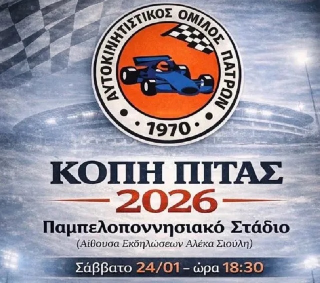 Την ετήσια εκδήλωση Κοπής Πίτας για το 2026 διοργανώνει ο Αυτοκινητιστικός Όμιλος Πατρών, προσκαλώντας μέλη, φίλους και υποστηρικτές σε μια βραδιά με εορταστικό αλλά και συμβολικό χαρακτήρα για την έναρξη της νέας αγωνιστικής χρονιάς.