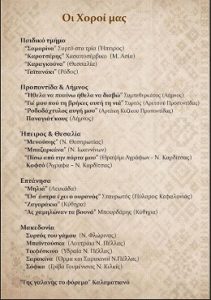 Κατά τη διάρκεια της εκδήλωσης οι χορευτικές ομάδες του συλλόγου θα παρουσιάσουν χορούς από διάφορα μέρη της Πατρίδας μας.