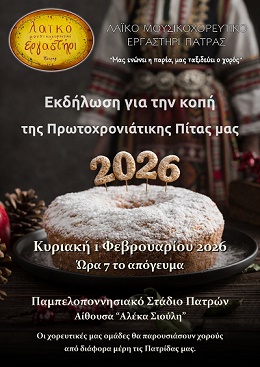Την Κυριακή 01 Φεβρουαρίου 2026 και ώρα 19:00, στην αίθουσα “ΑΛΕΚΑ ΣΙΟΥΛΗ” του Παμπελοποννησιακού Σταδίου, το Λαϊκό Μουσικοχορευτικό Εργαστήρι Πάτρας θα πραγματοποιήσει εκδήλωση για την κοπή της Πρωτοχρονιάτικης Πίτας έτους 2026.