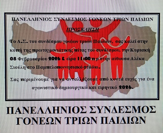 Ο Πανελλήνιος Σύνδεσμος Γονέων Τριών Παιδιών, την Κυριακή 8 Φεβρουαρίου 2026 και ώρα 11:00 π.μ., θα πραγματοποιήσει την κοπή της Πρωτοχρονιάτικης Πίτας στην αίθουσα ΑΛΕΚΑ ΣΙΟΥΛΗ του Παμπελοποννησιακού Σταδίου.