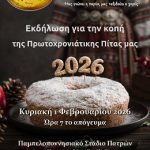 Την Κυριακή 01 Φεβρουαρίου2026 και ώρα19:00, στην αίθουσα “ΑΛΕΚΑ ΣΙΟΥΛΗ” του Παμπελοποννησιακού Σταδίου, το Λαϊκό Μουσικοχορευτικό Εργαστήρι Πάτρας θα πραγματοποιήσει εκδήλωση για την κοπή της Πρωτοχρονιάτικης Πίτας έτους 2026.